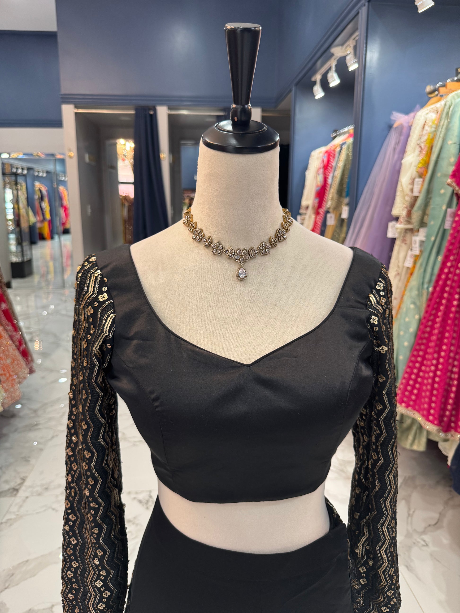 - This elegant black lehenga set is designed for timeless glamour and modern sophistication.