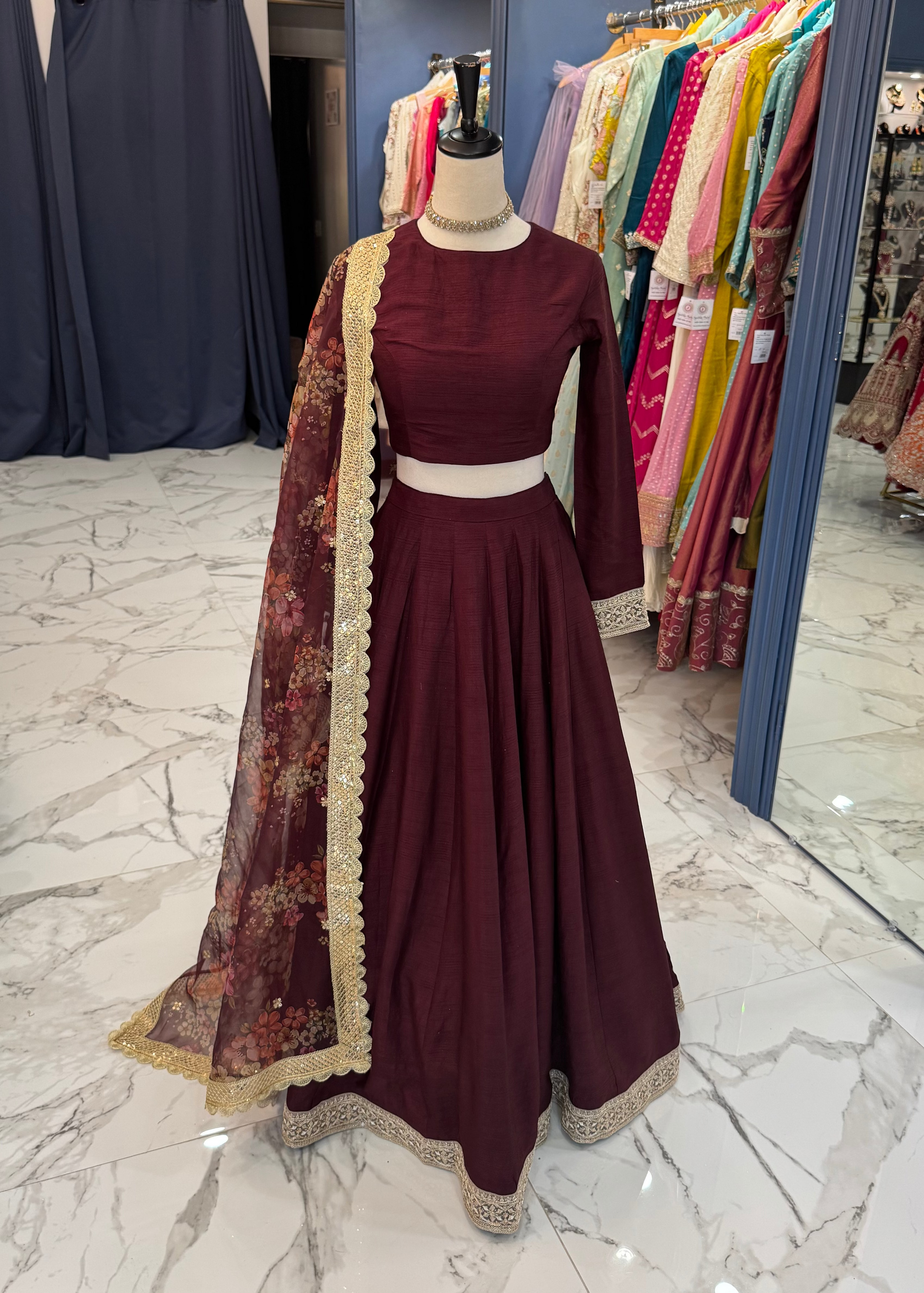 - Paired with a floral embroidered dupatta highlighted with intricate lace edging, this ensemble blends richness and softness.