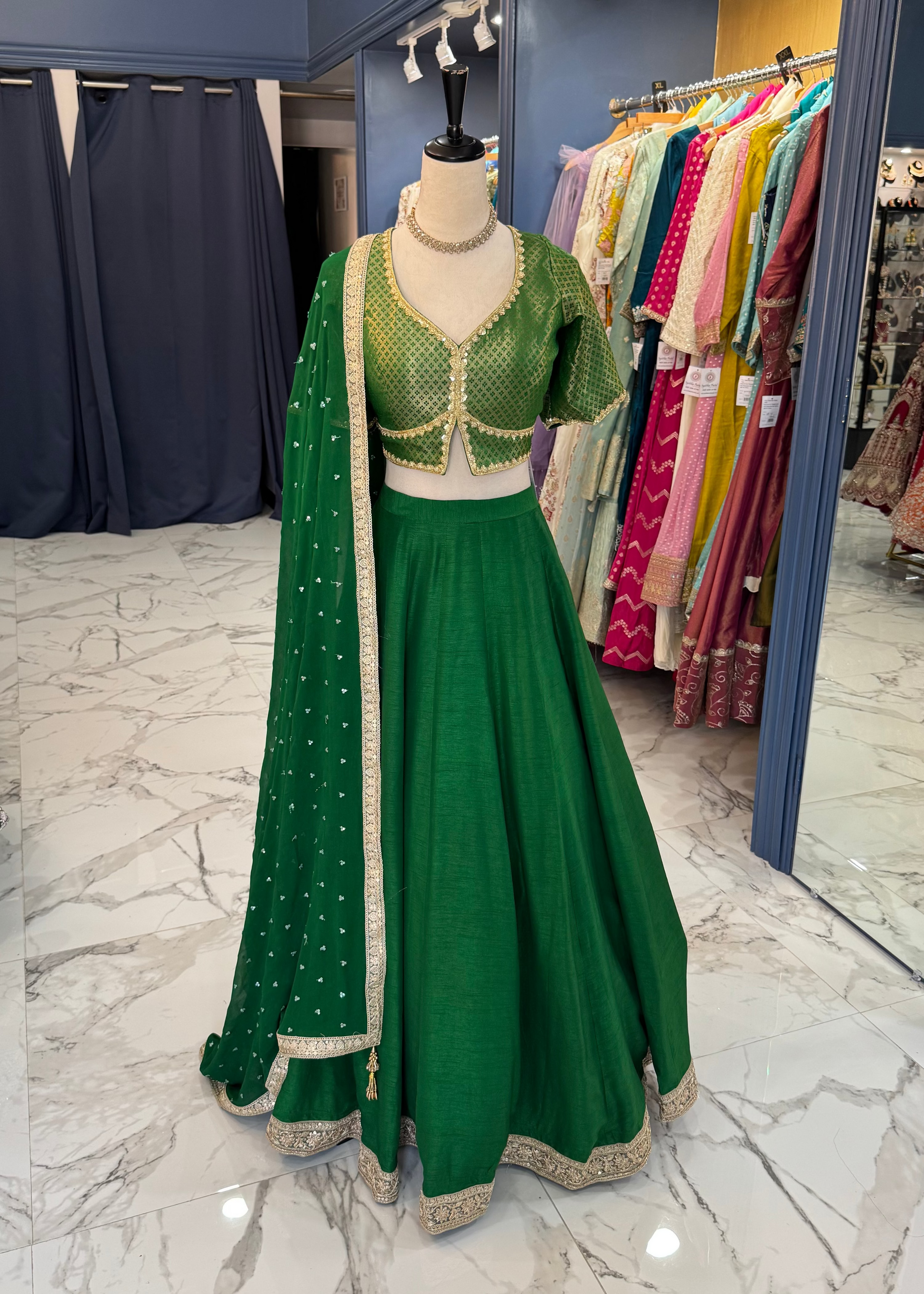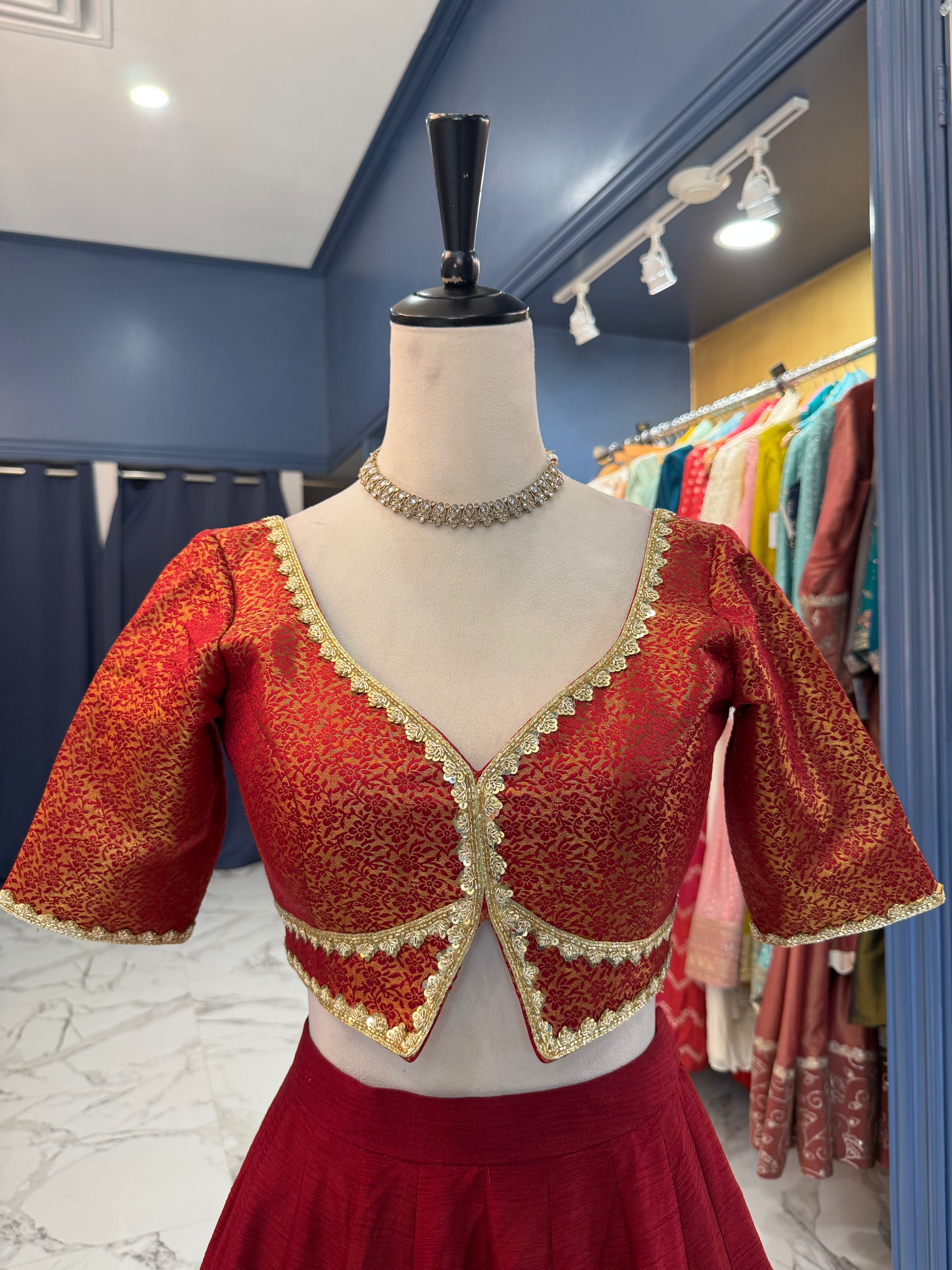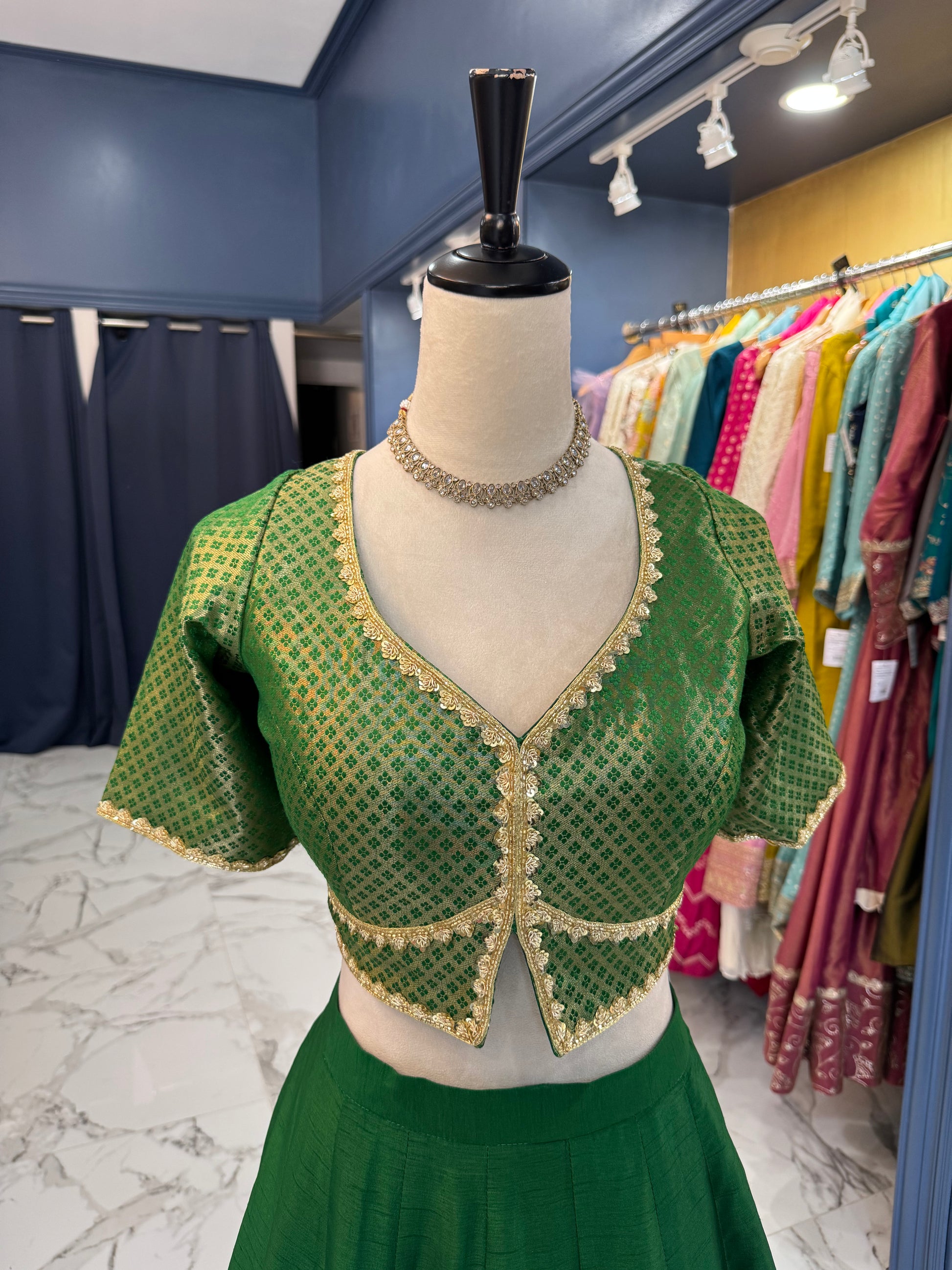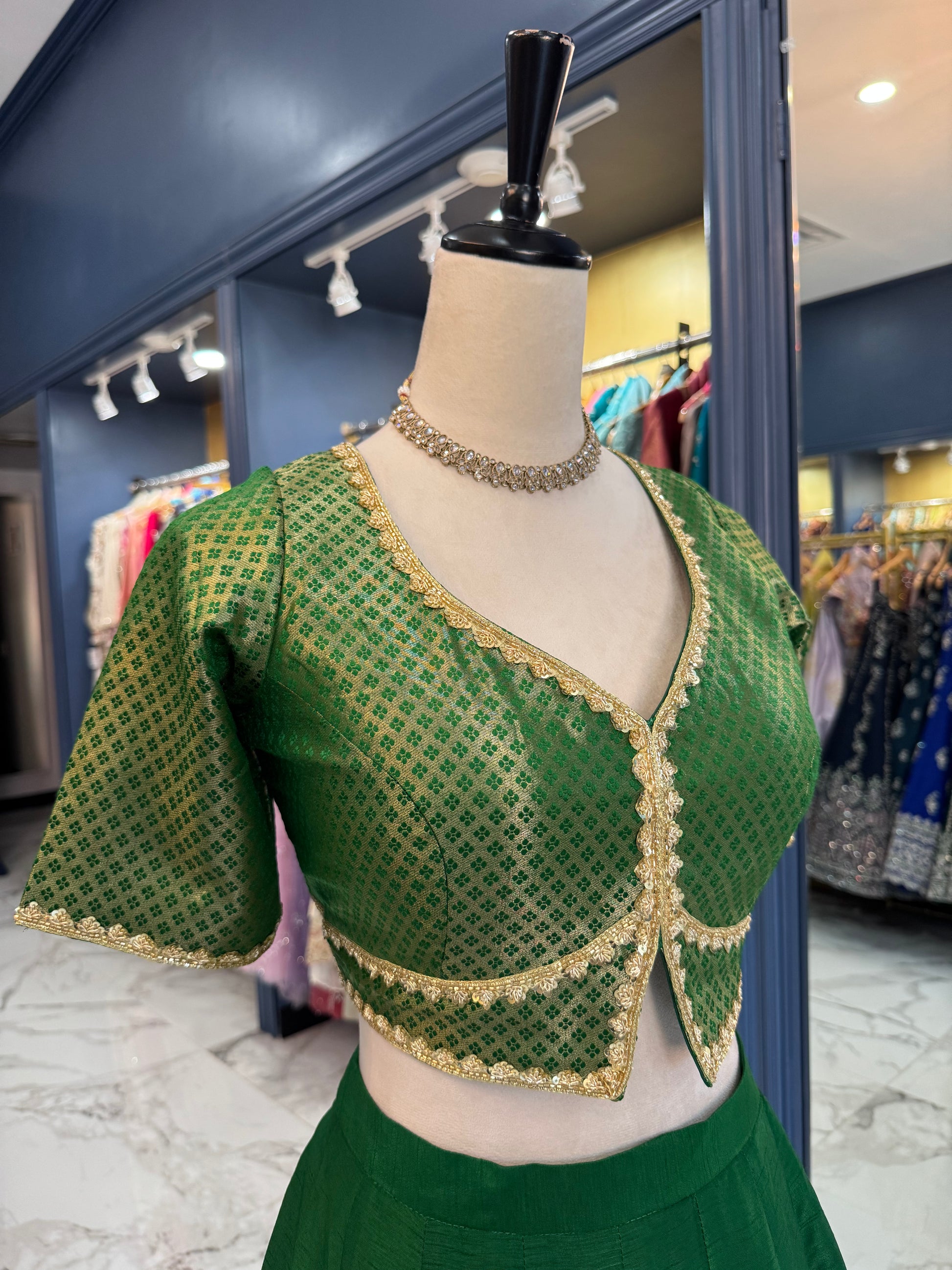 - This stunning lehenga set features a beautifully embroidered blouse with intricate gold detailing.